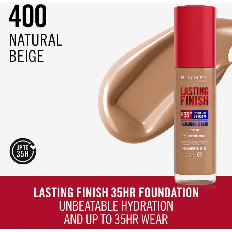 Geniet van ongelooflijke hydratatie en een tot wel 35-uur langhoudend kleurresultaat met Rimmel London Lasting Finish 35 Hour Foundation, Rimmels meest hydraterende en langhoudende foundation.•Een vegan foundation met een luchtige formule die je huid optimaal laat ademen en haar voorziet van een hoogdekkend kleurresultaat met een natuurlijk ogende finish•Klinisch bewezen verbeterde uitstraling van de huid•Clean foundation (D5-vrij) met een dierproefvrije en vegan formule, verrijkt met hyaluronzuur, vitamine E en 2% niacinamide voor een ongelooflijke hydratatieboost•Met SPF20 om de huid te beschermen tegen de schadelijke effecten van zonlicht, de huidbarrière te beschermen tegen vrije radicalen en oxidatieve stress (luchtvervuiling en blauw licht).•Vloeibare foundation met waterbestendige formule en veegvaste textuur die niet afgeeft en niet in de huidplooitjes gaat zitten