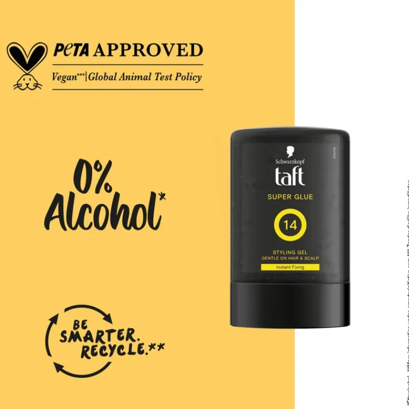 Taft Super Glue Styling Gel met instant bond-technologie geeft je haar een onmiddellijke en sterke hechting, maar plakt niet. De gel is gemakkelijk uit te wassen en is vrij van alcohol (ethylalcohol).