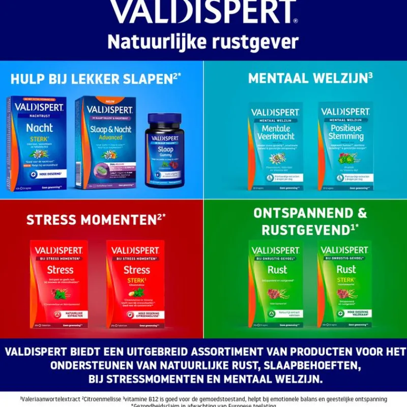 Valdispert Mentale Veerkracht is een product van het Mentaal Welzijn assortiment: producten die je helpen je lekker in je vel te blijven voelen, waardoor je in balans blijft en je het beste uit jezelf kunt halen. Mentale Veerkracht is een speciaal op maat gemaakte mix van natuurlijke kruidenextracten en vitamine B12 en is van de hoogste kwaliteit.