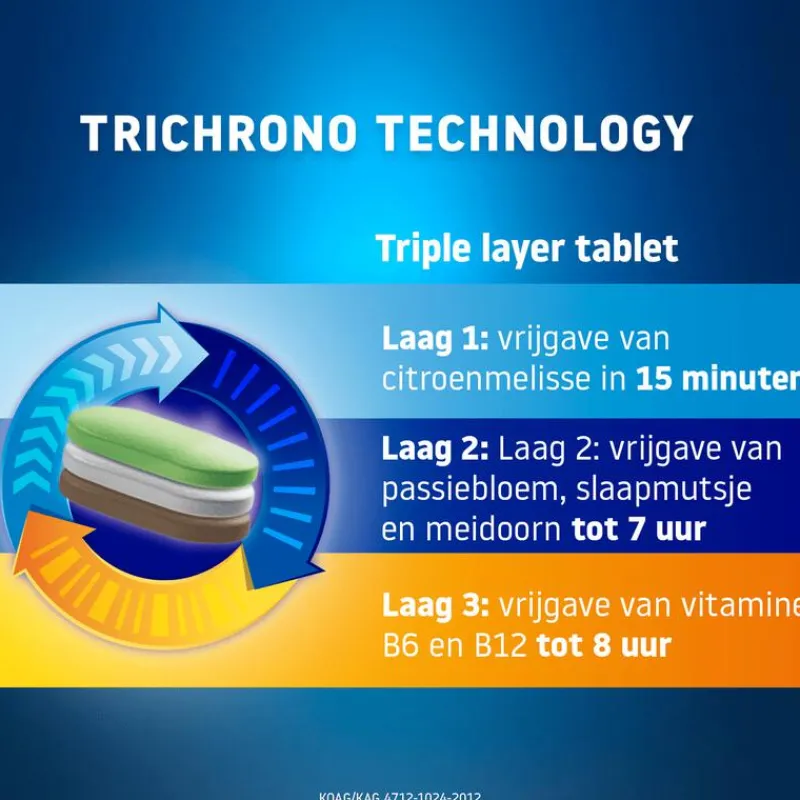 Valdispert Slaap & Fris Wakker helpt bij sneller in slaap vallen (1*), ondersteunen van de slaapkwaliteit (2*) en om uitgerust wakker te worden (4*). Het triple layer tablet met de TriChrono Technology geeft de ingrediënten in 3 fases gedurende de nacht af: laag 1: vrijgave van citroenmelisse in 15 minuten – laag 2: vrijgave van passiebloem, slaapmutsje en meidoorn tot 7 uur – laag 3: vrijgave van vitamine B6 en B12 tot 8 uur. Valdispert, natuurlijke rustgever sinds 1924.