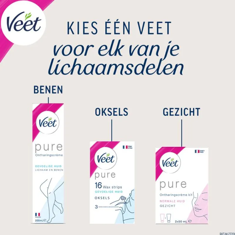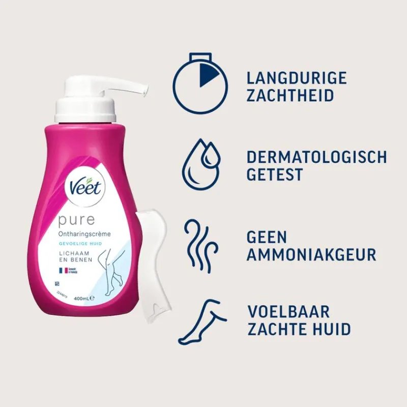 Ontdek de Pure ontharingscrème van Veet: een formule met 35% minder chemische ingrediënten* voor een zijdezachte huid met een frisse parfum. Deze verpakking bevat 1 creme tube 400ml en 1 spatel.* vergeleken met de vorige formule met dezelfde geurbasis