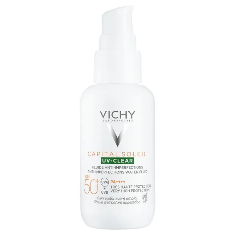 Vichy Capital Soleil UV Clear SPF 50+ is een ultralichte fluïde met zeer hoge bescherming (SPF 50+) die onzuiverheden en het vette uiterlijk van de huid voorkomt en vermindert, zonder sporen achter te laten.