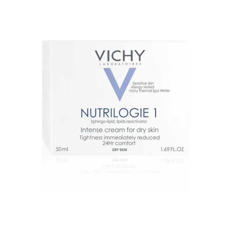 Vichy Nutrilogie 1 is een intensieve gezichtscrème voor een droge huid. Deze crème kalmeert de huid onmiddellijk en biedt tot 24 uur hydratatie en comfort. De formule is verrijkt met Sphingo-lipide™, het resultaat van 10 jaar onderzoek, een ultra-voedend gepatenteerd actief ingrediënt dat het lipidetekort compenseert. Het helpt de huid haar eigen lipiden opnieuw te produceren en haar hydrolipidenlaag te herstellen om vochtverlies te verminderen. Na slechts 28 dagen herstelt de huid haar natuurlijke hydratatieniveau.