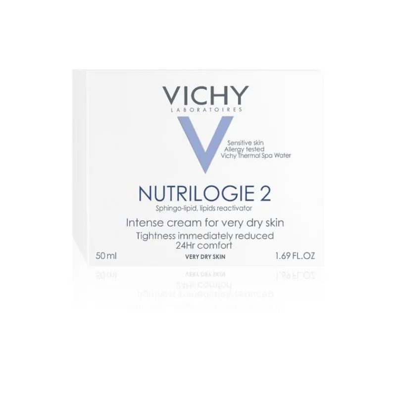 Vichy Nutrilogie 2 is een intensieve gezichtscrème voor een gevoelige, zeer droge huid. Deze crème kalmeert de huid onmiddellijk en biedt tot 24 uur hydratatie en comfort. De formule is verrijkt met Sphingo-lipide™, het resultaat van 10 jaar onderzoek. Het is een ultravoedend gepatenteerd actief ingrediënt dat het gebrek aan lipiden compenseert. Het is meer dan alleen een actief ingrediënt om het gebrek aan lipiden te compenseren: het helpt de huid om te leren haar eigen lipiden te produceren, waardoor de hydrolipidenlaag weer wordt opgebouwd en vochtverlies wordt beperkt.