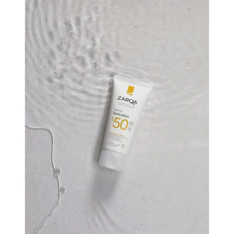 ZARQA SunLotion SPF50 – met huid- en milieuvriendelijke UVA/UVB filters – is zonbescherming met zeer hoge spf voor intensieve bescherming van zelfs de meest gevoelige huid. De parfumvrije en waterbestendige formule smeert prettig, trekt snel in, plakt niet en laat geen witte waas achter. De lotion is zo mild dat deze gebruikt kan worden bij een zon- en allergie- gevoelige huid, en helpen bij het kalmeren van een geïriteerde huid. Voor het hele gezin.