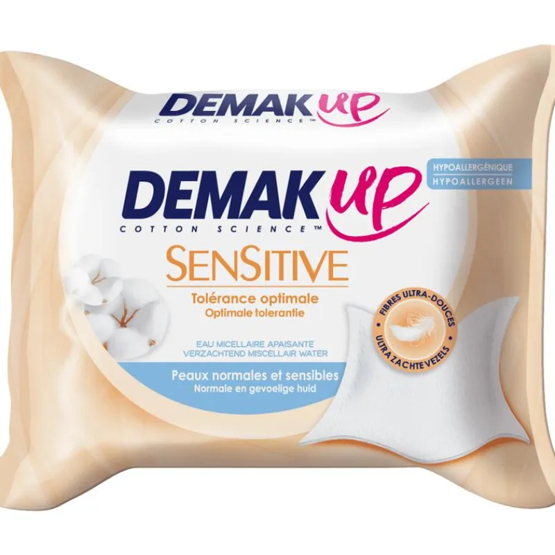 Demak’Up Sensitive Reinigingsdoekjes zijn geïmpregneerd met een reinigende emulsie van katoenextracten en micellair water. De reinigingsdoekjes bevatten geen parabenen en hebben een huidvriendelijke en herstellende werking voor de gevoelige huid. De Demak’Up Sensitive Reinigingsdoekjes reinigen en verfrissen de huid in één beweging.