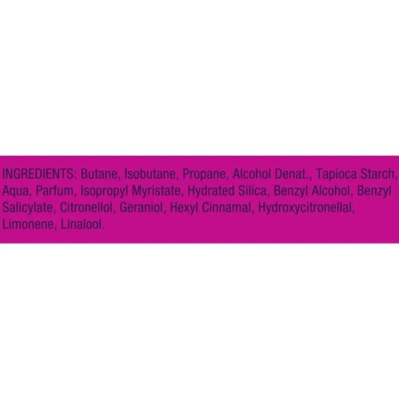 Butane, Isobutane, Propane, Alcohol Denat., Tapioca Starch, Aqua, Parfum, Isopropyl Myristate, Hydrated Silica, Benzyl Alcohol, Benzyl Salicylate, Citronellol, Geraniol, Hexyl Cinnamal, Hydroxycitronellal, Limonene, Linalool.