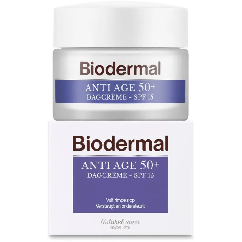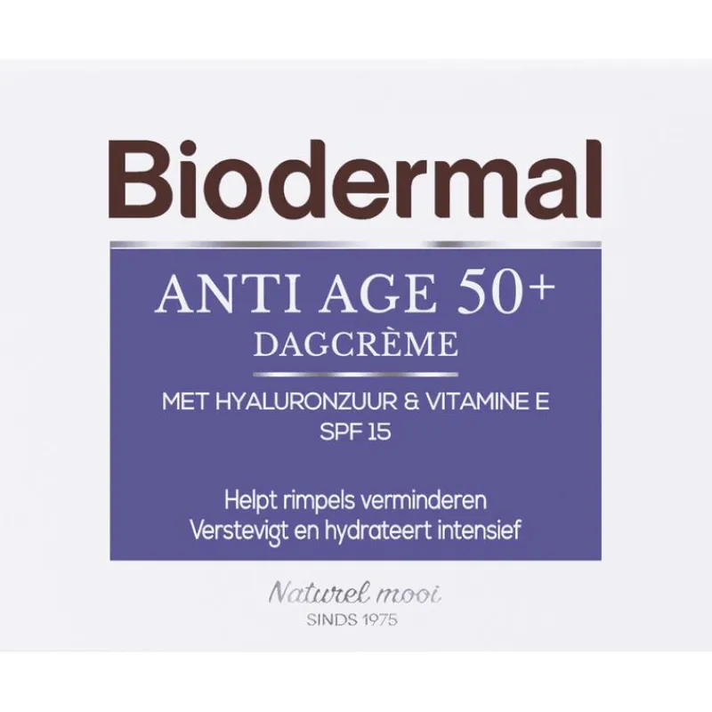 Het verouderingsproces versnelt vanaf het 50e levensjaar. De huid is droger, dunner en heeft een sterk verminderde veerkracht. Anti Age 50+ Dagcrème van Biodermal ondersteunt en verstevigt de huid gedurende de dag. Het vult rimpels op en egaliseert de huid. De Anti Age crème verbetert de elasticiteit van de huid, waardoor de huid soepeler, gladder en voller aanvoelt. Bevat SPF 15: beschermt tegen UVA- en UVB-straling.