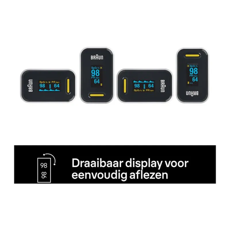 De Braun Pulse Oximeter 1 – Volwassenen vanaf 18 jaar kunnen hun ademhalingsgezondheid onder controle houden en hun zuurstofniveau altijd en overal in de gaten houden. Ideaal voor mensen met COPD, longontsteking, slaapapneu of sporters die hun vooruitgang willen bijhouden. Onze Braun Pulse Oximeter 1 heeft een eenvoudig vingerclipontwerp en éénknopsbediening. Het OLED-scherm met achtergrondverlichting kan op zes verschillende manieren draaien, zodat u snel uw resultaten vanuit elke hoek kunt zien. Bovendien schakelt het na acht seconden automatisch uit om aan te geven wanneer uw vinger zich in de juiste positie bevindt voor de meest nauwkeurige meting. Inclusief koord en twee AAA-batterijen.