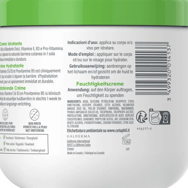 Cetaphil Hydraterende Crème is een rijke, niet vette, vocht inbrengende crème voor gezicht en lichaam. De crème is speciaal samengesteld volgens een nieuwe en verbeterde formule die een door dermatologen onderschreven mix van Vitamine B3, Provitamine B5 en hydraterende Glycerine bevat, om de weerstand van de gevoelige huid te helpen verbeteren. De hydraterende crème is verrijkt met Zoete Amandelolie en helpt om het vochtgehalte van de huid intensief aan te vullen en vochtverlies te voorkomen.