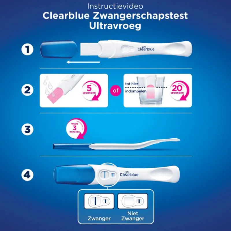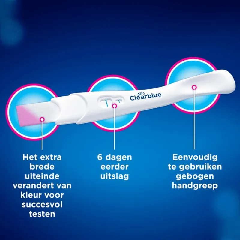 Lees altijd eerst de bijsluiter van uw medicijnen voordat u een test uitvoert. Een onterechte positieve uitslag kan worden veroorzaakt door medicatie die hCG bevat en door bepaalde zeldzame medische aandoeningen. Een buitenbaarmoederlijke of recente zwangerschap (zelfs als de zwangerschap niet is voldragen) kan misleidende uitslagen opleveren. Als u (bijna) in de menopauze bent, kan u ook een onterechte uitslag Zwanger krijgen terwijl u niet zwanger bent. De test zou NIET moeten worden beïnvloed door hormoonbehandelingen met clomifeencitraat, reguliere pijnstillers, alcohol, antibiotica of de anticonceptiepil. Als u een onverwachte uitslag krijgt, dient u deze te bespreken met uw huisarts.*Laat u weten hoeveel weken (Clearblue digitale zwangerschapstest met wekenindicator): het aantal weken na bevruchting wordt afgebeeld als 1-2, 2-3 of 3+. *De test met de snelste uitslag (Clearblue ultravroege zwangerschapstest): 79% van de uitslag Zwanger kan 6 dagen voor uw gemiste menstruatie worden gedetecteerd. *Het meest verkochte merk van zwangerschaps- en vruchtbaarheidstesten voor thuisgebruik ter wereld. Gebaseerd op internationale verkoopcijfers in bijna 20 landen, verzameld met behulp van onafhankelijke marktonderzoeksgegevens. *Meer dan 99% nauwkeurig: meer dan 99% nauwkeurig bij het detecteren van zwangerschap vanaf de dag dat uw menstruatie zou moeten beginnen (Clearblue zwangerschapstesten). Meer dan 99% nauwkeurig bij het detecteren van de LH-piek (Clearblue ovulatietesten). 99% nauwkeurig bij het detecteren van de LH-piek (Clearblue geavanceerde vruchtbaarheidsmonitor). *Clearblue is veruit het nauwkeurigst: meer dan 99% nauwkeurig bij het detecteren van zwangerschap vanaf de dag dat uw menstruatie zou moeten beginnen (Clearblue zwangerschapstesten). Meer dan 99% nauwkeurig in het detecteren van de LH-toename (Clearblue ovulatietesten). *Net zo nauwkeurig als een echo om te zien hoelang u zwanger bent (Clearblue digitale zwangerschapstest met wekenindicator): weken komt in 97% overeen met de uitslag van latere echo-onderzoeken. Dit is op basis van een onderzoek onder 187 vrouwen waarbij het aantal weken werd vergeleken met een echo-onderzoek. *Snelle uitslag na 1 minuut (Clearblue zwangerschapstest met snelle detectie en Clearblue Flip & Click zwangerschapstest): de uitslag Zwanger kan vanaf de dag van de gemiste menstruatie al na 1 minuut verschijnen. Wacht 3 minuten om de uitslag Niet Zwanger te bevestigen. *Uitslagen 6 dagen voor uw gemiste menstruatie (Clearblue ultravroege zwangerschapstest): 79% van de uitslag Zwanger kan 6 dagen voor uw gemiste menstruatie worden gedetecteerd. *Uitslagen 6 dagen voor uw gemiste menstruatie (Clearblue digitale ultravroege zwangerschapstest): 78% van de uitslag Zwanger kan 6 dagen voor uw gemiste menstruatie worden gedetecteerd. *Uitslagen 6 dagen voor uw gemiste menstruatie (Clearblueultravroege GEAVANCEERDE zwangerschapstest): 77%van de uitslag Zwanger kan 6 dagen voor uw gemiste menstruatie worden gedetecteerd. *Uitslagen 5 dagen voor uw gemiste menstruatie (Clearblue digitale zwangerschapstest met wekenindicator): 80% van de uitslag Zwanger kan 5 dagen voor uw gemiste menstruatie worden gedetecteerd. SPD Swiss Precision Diagnostics GmbH, Route de St Georges 47, 1213 Petit-Lancy, Genève, Zwitserland. BE: 0800 815 46. NL: 0800 394 9031. www.clearblue.com. Naam en adres van de gemachtigde vertegenwoordiger: MDSS GmbH, Schiffgraben 41 Hannover 30175, Duitsland: [email protected].