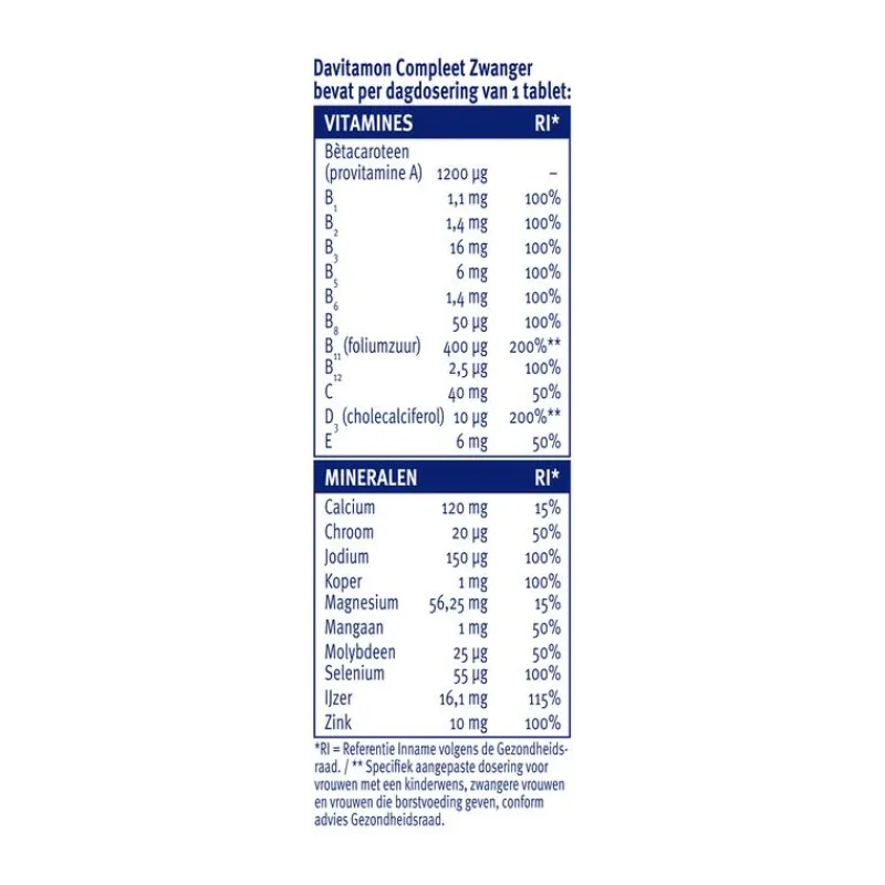 DAVITAMON COMPLEET ZWANGER is een voedingssupplement speciaal afgestemd op de behoefte van je lichaam als aanstaande moeder. Davitamon Compleet Mama bevat extra foliumzuur, 200% van de ADH, en draagt hierdoor bij aan de ontwikkeling van de baby en de vorming van de placenta. De tabletten bevatten daarnaast ook andere vitamines en mineralen en zijn hierdoor: • Goed voor de WEERSTAND (bètacaroteen, vitamine B6, B11, B12, C, D, koper, selenium, ijzer en zink)• Goed voor de VRUCHTBAARHEID (zink)• Goed voor het IJZERGEHALTE in het bloed (bètacaroteen, vitamine B2 en C)FOLIUMZUUR DRAAGT BIJ AAN DE ONTWIKKELING VAN DE BABYDavitamon Compleet Mama bevat extra foliumzuur, 200% van de ADH, en draagt hierdoor bij aan de ontwikkeling van de baby en de vorming van de placenta. Daarnaast helpt foliumzuur bij de vorming van rode bloedcellen en draagt het bij aan de groei van het ongeboren kind. Het is belangrijk dat er vanaf het begin van de zwangerschap voldoende foliumzuur in je lichaam aanwezig is.ONTDEK DE VOORDELEN:• Bevat foliumzuur (draagt bij aan de ontwikkeling van de baby)• Geen suiker, conserveermiddelen of aroma’s• Veel vitamine D3 (goed voor de weerstand)DAVITAMON, SINDS 1928Om goed te kunnen blijven functioneren heeft ons lichaam elke dag vitamines en mineralen nodig. Daarom heeft Davitamon voor iedereen, in elke levensfase, een ander product. Zo krijg jij de juiste aanvulling op je voeding. Davitamon biedt al sinds 1928 betrouwbare voedingssupplementen aan van de hoogste kwaliteit.Zwanger worden doe je niet alleen, ook de conditie van de man dient in goede staat te zijn. Davitamon heeft , als aanvulling op de voeding, een multivitamine ontwikkeld speciaal voor de man! Davitamon Compleet Man is een breed, uitgebalanceerd multivitamine en mineralen complex speciaal afgestemd op de behoeften van volwassen mannen. Selenium en zink zijn goed voor de vruchtbaarheid van de man en zijn GOED VOOR DE KWALITEIT VAN HET SPERMA. Zink draagt bij aan de beweeglijkheid en productie van de zaadcellen en magnesium in DAVITAMON COMPLEET MAN draagt bij aan een goede werking van spieren. KLIK HIER VOOR DAVITAMON COMPLEET MAN