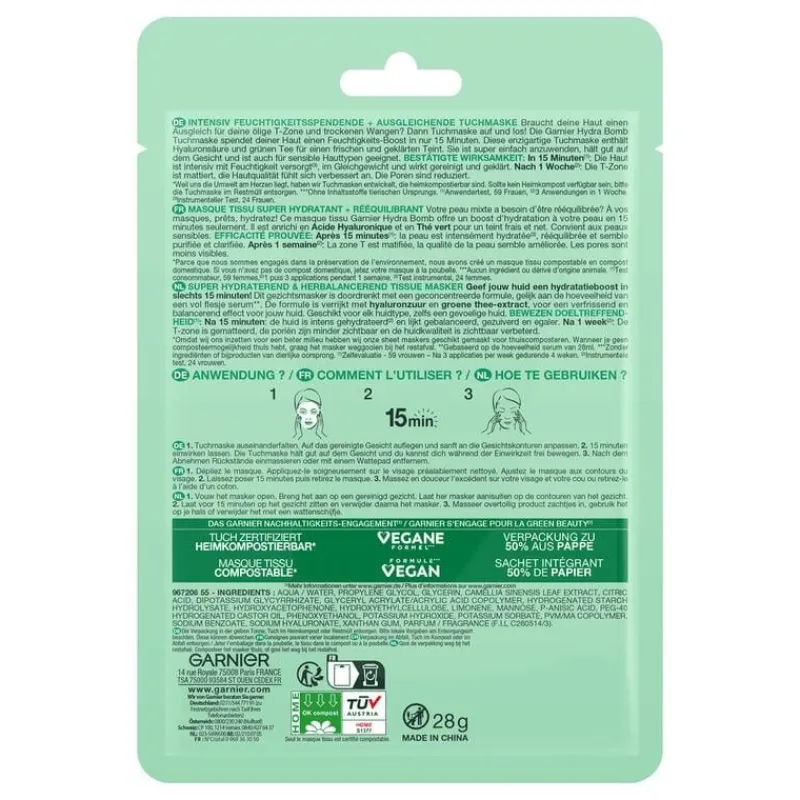 Garnier SkinActive Hydra Bomb Sheet Mask Groene Thee Gezichtsmasker voor Normale & Gemengde Huid balanceert en zuivert de huid.
