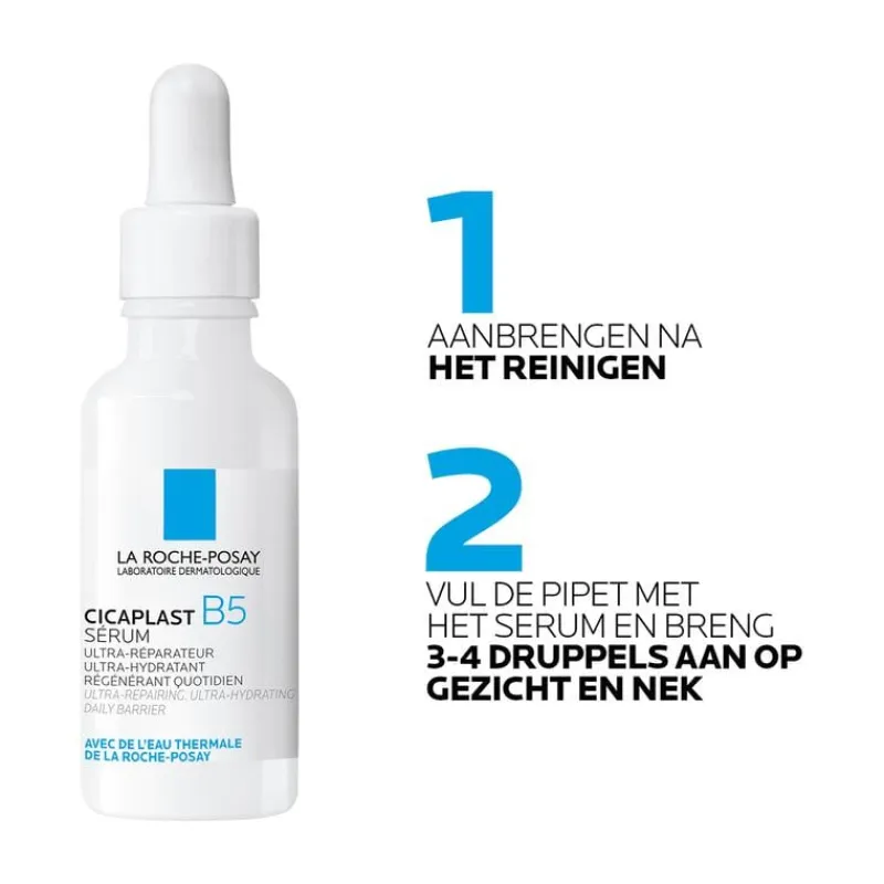 La Roche-Posay Cicaplast B5 gezichtsserum is een ultra hydraterend herstelondersteunend serum waarvan wetenschappelijk is bewezen dat het de huid hydrateert en de huidbarrière vanaf 1 uur helpt herstellen (instrumentele test, 25 proefpersonen). De unieke formule vormt een dunne laag op de huid om te beschermen tegen externe agressoren en het natuurlijke herstel van de huid te ondersteunen. Cicaplast B5 serum helpt de teint te egaliseren en de huidtextuur te verfijnen voor een gezonder-uitziende, stralende huid. De lichte, niet-vette serumtextuur hydrateert en helpt de huid onmiddellijk te kalmeren. Zo blijft de huid beschermd tegen droogheid en een geïrriteerd gevoel.