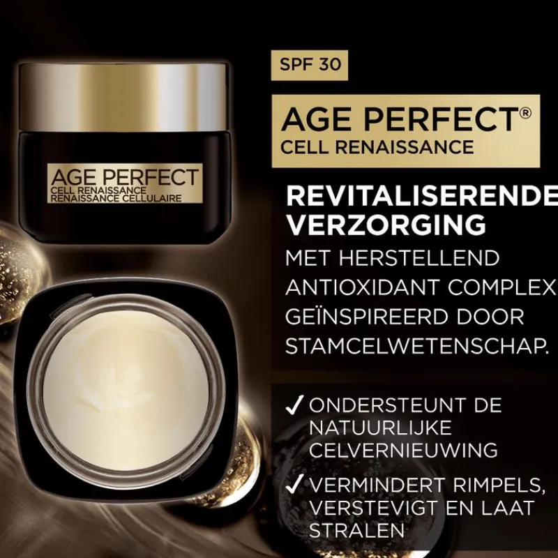 L’Oréal Paris Age Perfect Cell Renaissance Revitaliserende Verzorging dagcrème SPF 30 bevat een Herstellend Antioxidantcomplex met neohesperidine en vitamine E die zorgt voor een zachtere, stevigere en stralende huid. Effectief tegen rimpels.