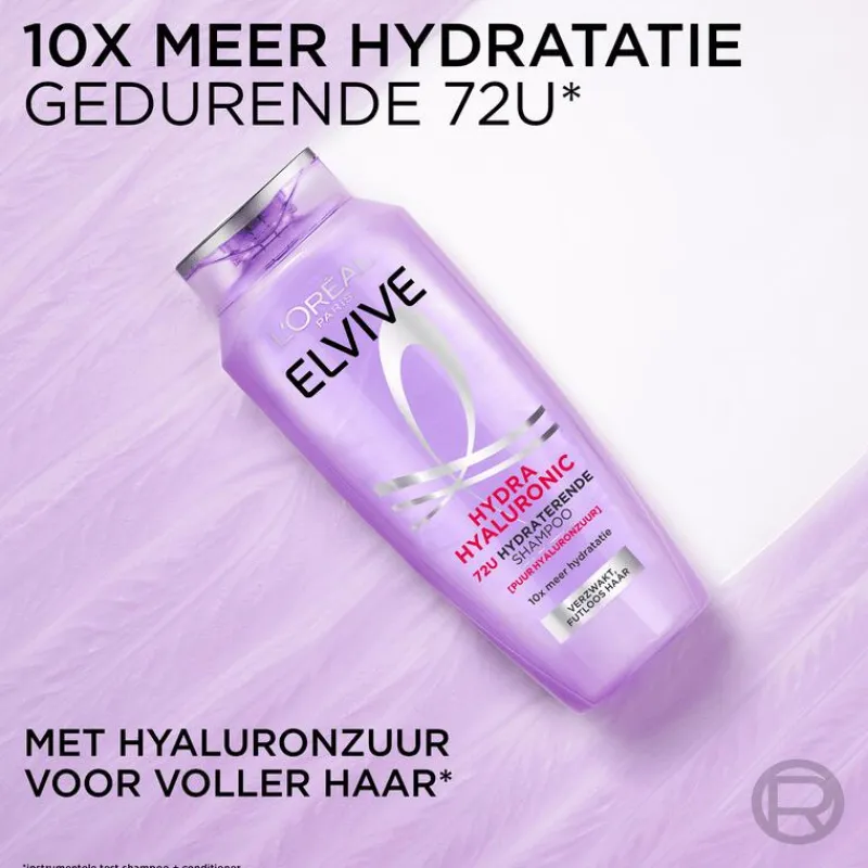 L’Oréal Paris Elvive Hydra Hyaluronic Shampoo is een shampoo die speciaal ontwikkeld is om verzwakt, futloos haar intensief te hydrateren. De formule is verrijkt met hyaluronzuur, een natuurlijk ingrediënt met hydraterende eigenschappen. Het helpt het haar te hydrateren en zorgt ervoor dat het vocht vasthoudt, voor 10x meer hydratatie*** en een gezonde glans. De nieuwe duurzame verpakking van L’Oréal Paris Elvive Hydra Hyaluronic Shampoo is nu verkrijgbaar in het standaard 250ml formaat en bevat 20% minder plastic**. L’Oréal Paris Elvive Hydra Hyaluronic Shampoo is verrijkt met hyaluronzuur, een natuurlijk ingrediënt dat zorgt voor hydratatie tot 72 uur***. Het resultaat: gehydrateerd haar met een gezonde glans. De nieuwe verpakking van deze shampoo is gemaakt van gerecycled plastic* en bevat 20% minder plastic**. Met deze milieubewuste verpakking draag je bij aan een schonere planeet, zonder in te leveren op kwaliteit en verzorging. *Met uitzondering van de additieven, kleurstoffen en labels. **Ten opzichte van de vorige verpakking. Plastic vermindering varieert afhankelijk van het verpakkingsformaat. ***Instrumentele test shampoo en conditioner.