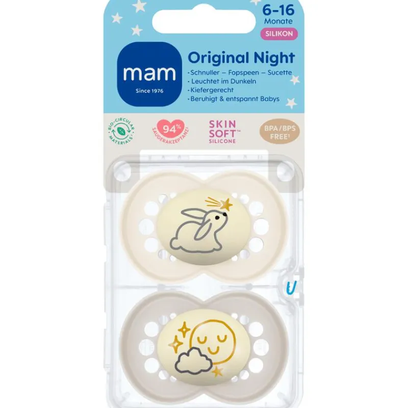 De MAM Original Night speen licht op in het donker. Door de Glow In The Dark functie kunnen baby’s en ouders de fopspeen gemakkelijk terugvinden in het donker, wat de nacht een stuk rustiger maakt. MAM fopspenen zijn ontwikkeld in samenwerking met tandartsen en hebben een orthodontische vorm voor een gezonde tand- en kaakontwikkeling. Dankzij het symmetrische speenschild ligt de speen altijd goed in de mond van de baby. De luchtgaten, het gebogen speenschild en de noppen aan de binnenkant van het schild zorgen dat de speen bijzonder zacht aanvoelt voor de gevoelige babyhuid. De speenknop is gemakkelijk vast te pakken door kleine babyhandjes. De MAM Original Night fopspeen is gemaakt van SkinSoft™ Silicone, waardoor de speen door 94% van de baby’s wordt geaccepteerd.² De fopspenen worden geleverd in een praktisch sterilisatie- en transportdoosje, waarin ze snel en zonder extra apparatuur in de magnetron gesteriliseerd kunnen worden. Dit zorgt voor een besparing van 77% CO₂, energie en water.³ De MAM Original is de eerste klimaatneutrale MAM fopspeen. Het schild en de knop zijn gemaakt van duurzaam, bio-circulair materiaal om de CO₂-voetafdruk zo klein mogelijk te houden. De resterende CO₂ wordt door MAM gecompenseerd in samenwerking met Climate Partner.¹ De MAM Original fopspeen voldoet aan de EN1400 norm en is BPA- en BPS-vrij.