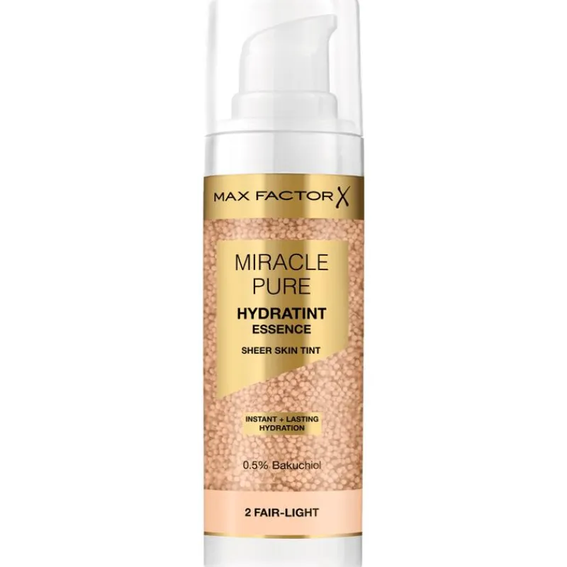 Max Factor Miracle Pure Hydratint Essence, de miraclemaker in huidverzorging voor make-upartiesten. Dit product geeft de huid een sterke hydratatieboost, waarna ze heerlijk fris aanvoelt en tot wel 24 uur lang optimaal gehydrateerd blijft. De vegan formule bestaat voor 71% uit water en is voor 0,5% verrijkt met bakuchiol en in microbolletjes ingekapselde kleurpigmenten. De formule is makkelijk te blenden en zorgt voor een stralend en toch heel natuurlijk dekkend kleurresultaat. Deze helder stralende getinte huidverzorging verbetert de veerkracht van de huid; een klinisch bewezen effect na 14 dagen gebruik!