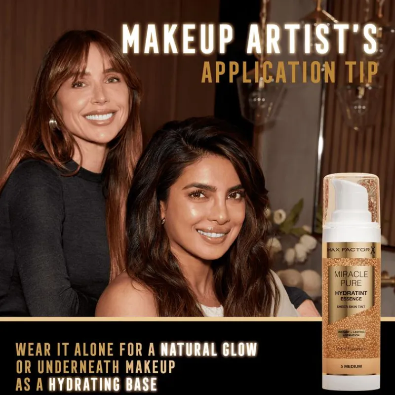 Max Factor Miracle Pure Hydratint Essence, de miraclemaker in huidverzorging voor make-upartiesten. Dit product geeft de huid een sterke hydratatieboost, waarna ze heerlijk fris aanvoelt en tot wel 24 uur lang optimaal gehydrateerd blijft. De vegan formule bestaat voor 71% uit water en is voor 0,5% verrijkt met bakuchiol en in microbolletjes ingekapselde kleurpigmenten. De formule is makkelijk te blenden en zorgt voor een stralend en toch heel natuurlijk dekkend kleurresultaat. Deze helder stralende getinte huidverzorging verbetert de veerkracht van de huid; een klinisch bewezen effect na 14 dagen gebruik!