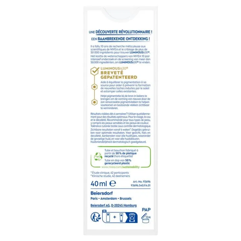 • Vermindering van de hoeveelheid verlaagt de mate van bescherming significant • Blijf niet te lang in de zon, zelfs niet wanneer u een zonnebeschermingsproduct gebruikt; overmatige blootstelling aan de zon vormt een ernstige bedreiging voor de gezondheid • Houd baby’s en jonge kinderen uit de volle zon • Vermijd contact met de ogen • Laat het product intrekken en vermijd direct contact met textiel en harde oppervlakken om vlekken te voorkomen. • Breng producten met LUMINOUS630® max. 4 keer per dag aan • Gebruik voor optimale resultaten ook de NIVEA LUMINOUS630® Antispot gezichtsverzorgingsproducten.