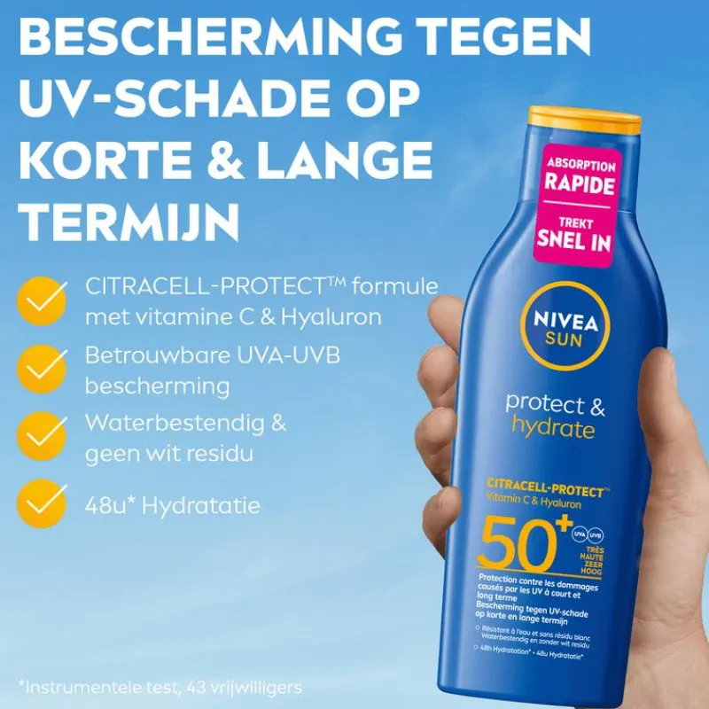 Zorg voor je huid met de vernieuwde NIVEA SUN Protect & Hydrate Zonnemelk SPF50+. Deze zonnemelk biedt betrouwbare UVA/UVB-bescherming tegen UV-schade, zowel op korte als lange termijn. Dankzij de innovatieve CitraCell-ProtectTM-formule met vitamine C en hyaluron creëert het een tweede beschermingslaag voor je huid, waardoor je optimaal beschermd bent. De lichte formule trekt sneller in en is gemakkelijk uit te smeren zonder een vettig gevoel of wit residu achter te laten.De hydraterende werking zorgt ervoor dat je huid tot wel 48 uur* zacht en gehydrateerd blijft, waardoor je huid er gezond en soepel uitziet, zelfs tijdens zonnige dagen. Of je nu een zonnebrandcrème gezicht zoekt, een zonnemelk voor dagelijks gebruik of een betrouwbare optie naast je zonnebrand spray, deze zonnemelk is een ideale keuze. Het product combineert effectieve zonbescherming met een ultiem huidcomfort.Perfect te combineren met je favoriete aftersun voor een complete zonverzorgingsroutine. *Instrumentele test, 43 vrijwilligers