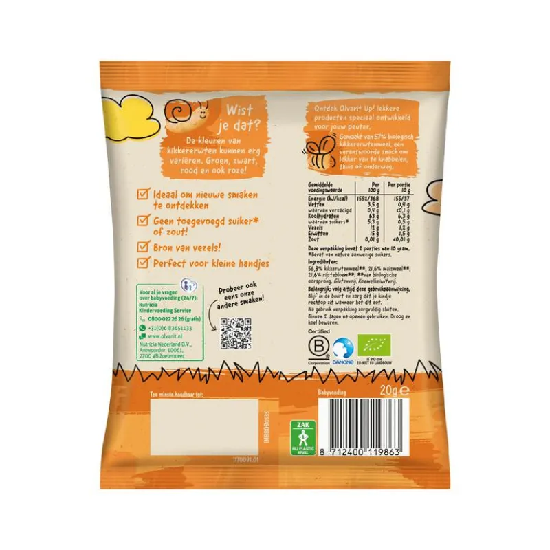 Olvarit UP! knabbels is een lekkere biologische snack speciaal ontwikkeld voor peuters vanaf 12 maanden oud.