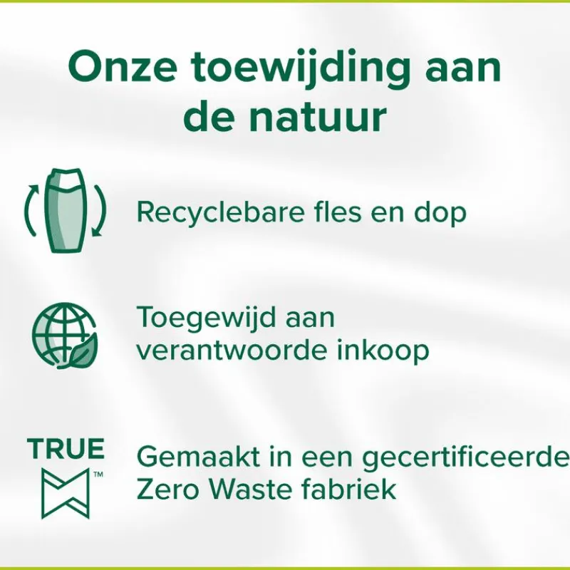 De douchecrème bevat niet alleen plantaardige melk, maar is ook gemaakt met ingrediënten van 95% natuurlijke oorsprong**. De bodywash heeft een voor 98% biologisch afbreekbare formule en zit in een recyclebare fles. De vegan douchecrème is ook dermatologisch getest.