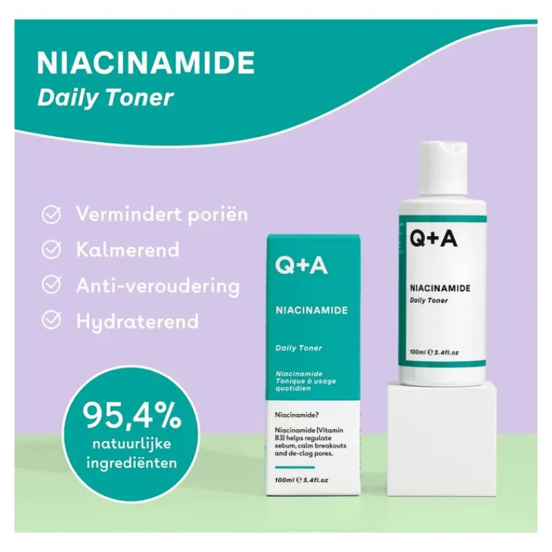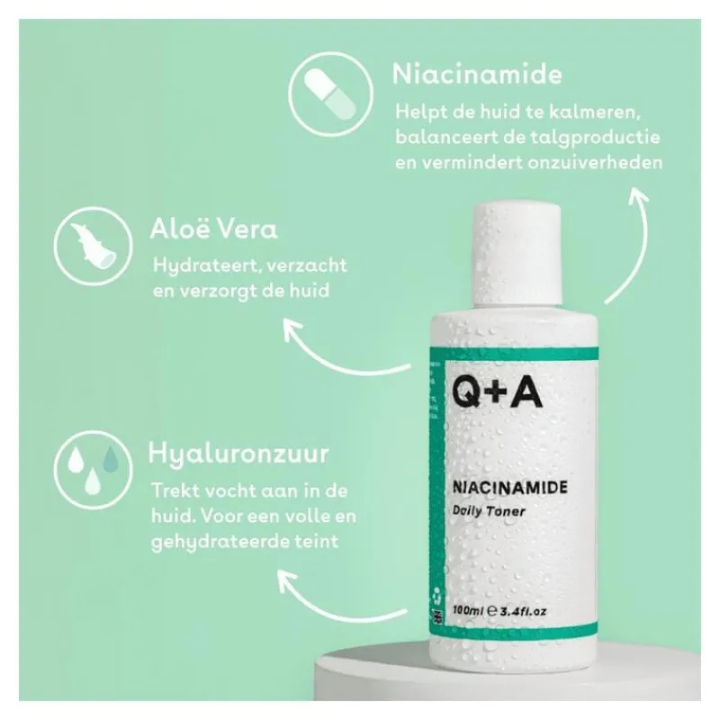 Met de Q+A Niacinamide Daily Toner maak je je verzorgingsroutine compleet. De toner verwijdert eventuele laatste restjes make-up en bereidt de huid voor op je nachtverzorging. Niacinamide ofwel vitamine B3, kalmeert en beschermt je huid tegen roodheid en oneffenheden. Hyaluronzuur hydrateert krachtig. Tot slot voedt ook aloë vera de huid en vormt een beschermende barrière tegen invloeden van buitenaf.