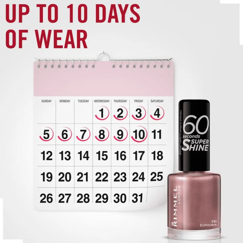 Shiny en verzorgde nagels in één minuut zijn binnen handbereik met de Rimmel London 60 seconds Supershine nagellak! Met de sneldrogende formule zijn jouw nagels snel droog. Dankzij de speciale 3-in-1 technologie zijn jouw nagels met een laag voorzien van een base coat, kleur en beschermende topcoat.