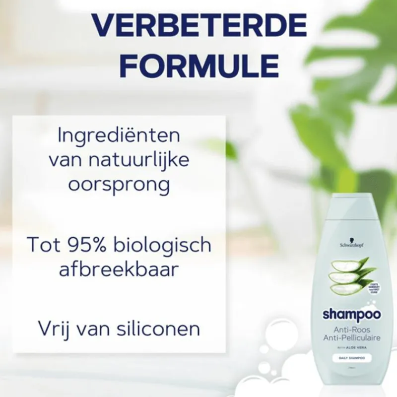 De Anti-Roos shampoo bestrijdt roos en kalmeert de jeukende hoofdhuid. De shampoo bevat aloë vera en is geschikt voor dagelijks gebruik. Alle formules van Schwarzkopf Shampoo zijn vegan.
