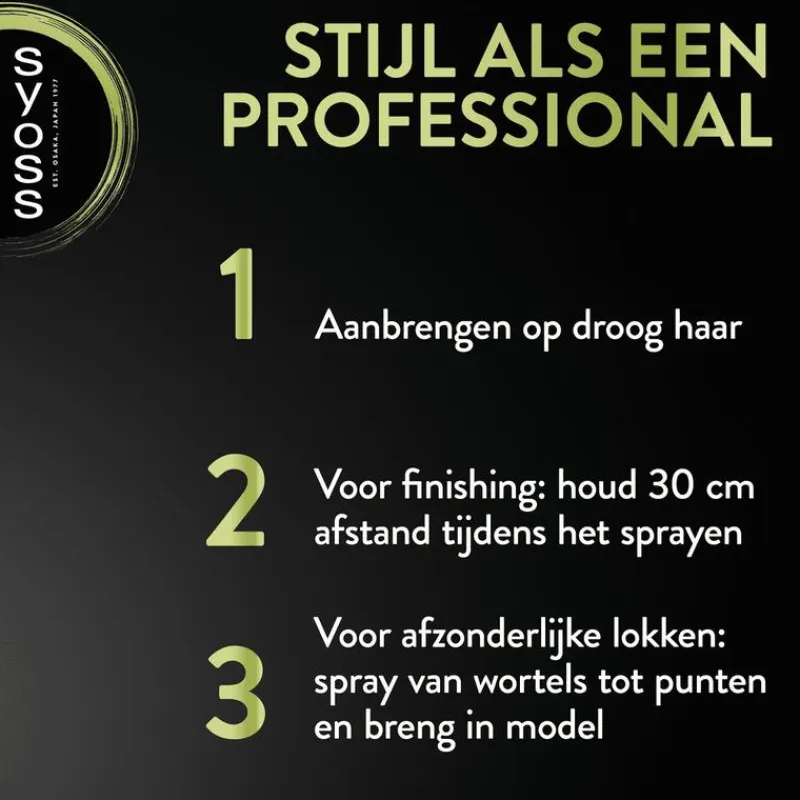 Aanbrengen op droog haar. Voor afwerking: op 30cm afstand sprayen. Voor extra volume: buig je hoofd voorover en spray in losgeschud haar. Als de spray verstopt is, dan de spraykop met warm water afspoelen. Gebruik voor optimale stylingresultaten ook Syoss mousses, gels of waxen.