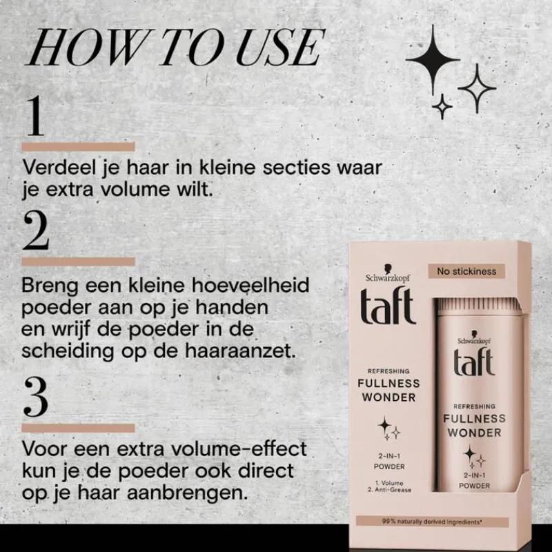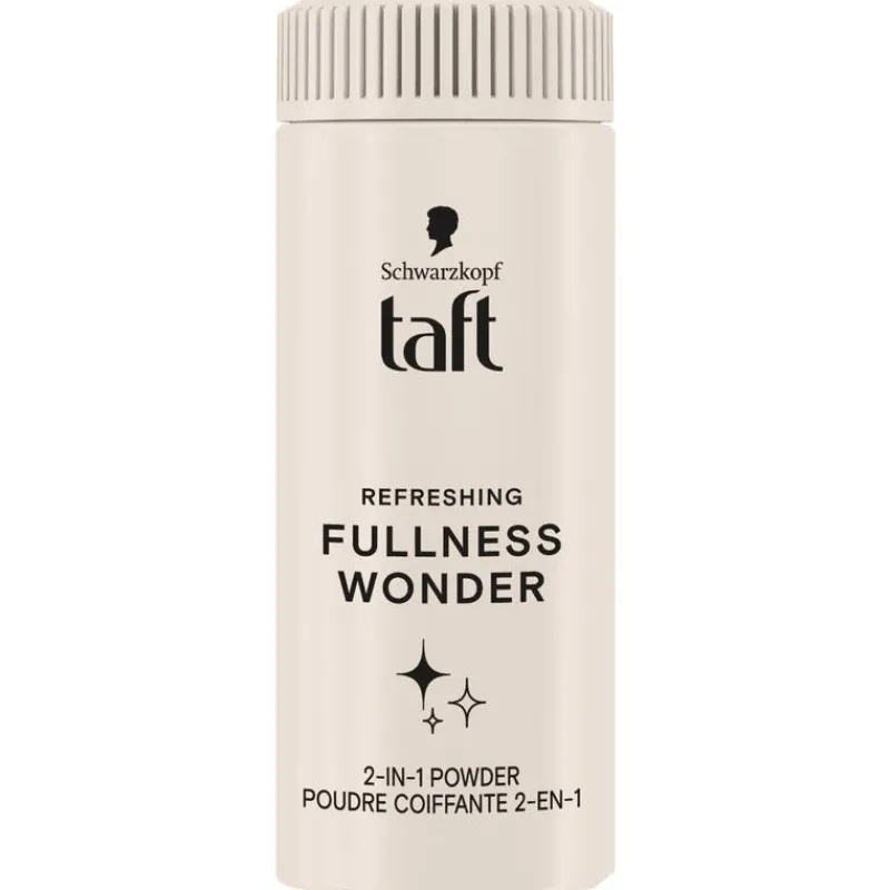 De 2-in-1 Taft Fullness Wonder Powder is een lichtgewicht styling poeder dat zorgt voor extra volume, onmiddelijke frisheid en anti-grease. De formule is geschikt voor alle haartypes, plakt niet en verzwaart het haar niet.