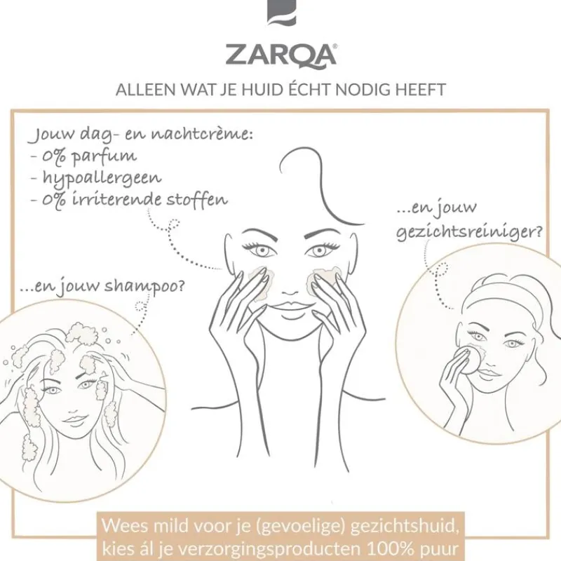 Zarqa is zo natuurlijk en mild mogelijk ontwikkeld om risico op allergie te minimaliseren. Zarqa bevat mineralen uit de Dode Zee en is ook geschikt voor de meest gevoelige huid. 0% parfum, dermatologisch getest, hypoallergeen