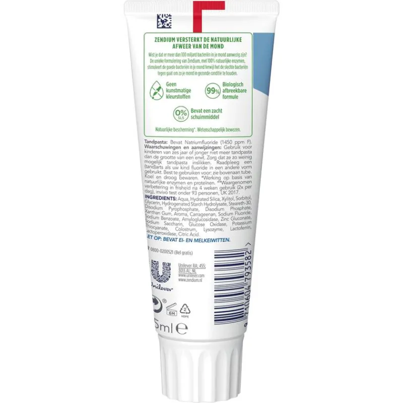 - Zendium Fresh+White Tandpasta bevat 100% natuurlijke enzymen