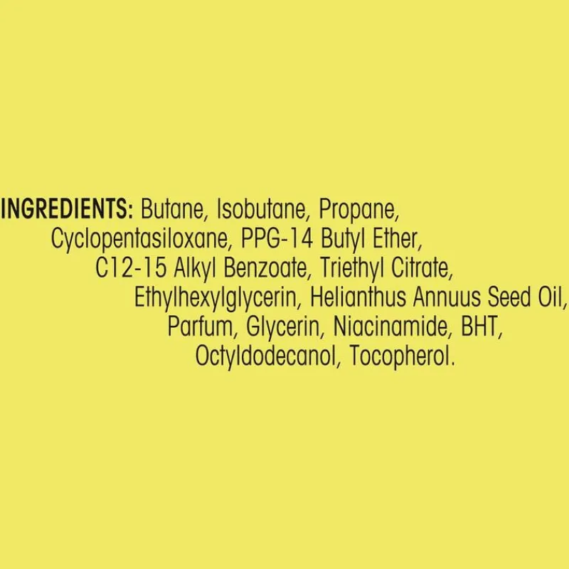 Butane, Isobutane, Propane, Cyclopentasiloxane, PPG-14 Butyl Ether, C12-15 Alkyl Benzoate, Triethyl Citrate, Ethylhexylglycerin, Helianthus Annuus Seed Oil, Parfum, Glycerin, Niacinamide, BHT, Octyldodecanol, Tocopherol.