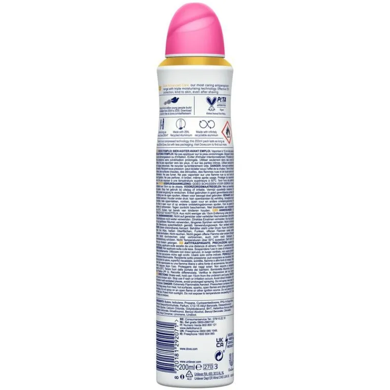 Dove Advanced Care Invisible Care Anti-Transpirant Deodorant Spray heeft een heerlijke geur van waterlelie en rozen en beschermt zowel je oksels als je kleding. Deze anti-transpirant is onzichtbaar bewezen op zwart en wit en is dus de perfecte oplossing tegen witte strepen en gele vlekken in je kleding. De Dove Advanced Care anti-transpiranten maken deel uit van de meest verzorgende lijn van Dove, met de verbeterde gepatenteerde formule zijn ze zacht voor de huid. Het Advanced Care assortiment van Dove biedt met de Triple Moisturising technologie tot 72 uur bescherming tegen zweet. De hele dag een fris en verzorgd gevoel – wat de dag je ook brengt!