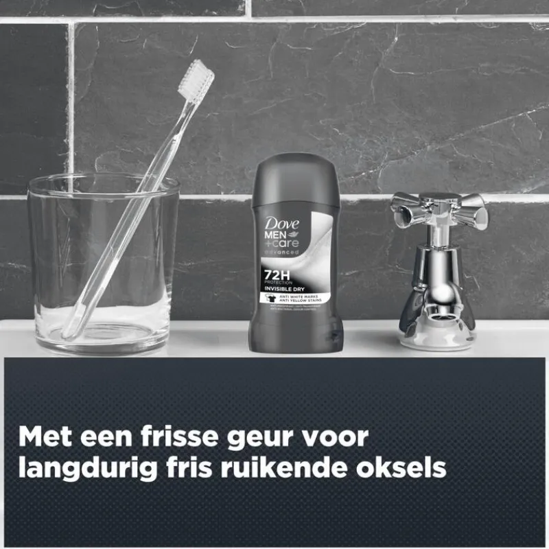 Dove Men+Care Advanced Invisible Dry Anti-Transpirant Deodorant Stick met anti-bacteriële geurbestrijding beschermt tot 72 uur lang tegen zweet en nare geurtjes en heeft een langdurig frisse geur. De milde formule van Dove Men+Care, verzorgt je huid en geeft je de bescherming die je nodig hebt. Verwen jezelf met deze deodorantstick die je 72 uur bescherming biedt tegen geur met de unieke verzorging die je gewend bent van Dove Men+Care. Deze anti-transpirant beschermt zowel je oksels als je kleding en is onzichtbaar bewezen op zwart en wit en is dus de perfecte oplossing tegen witte strepen en gele vlekken in je kleding.