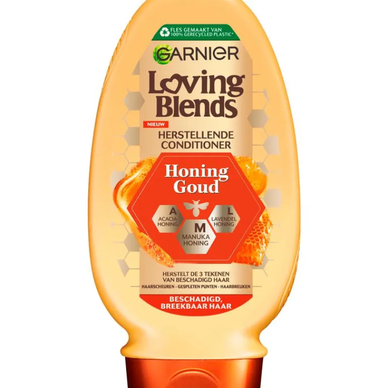 Garnier Loving Blends Honing Goud Conditioner is een herstellende conditioner van 97% natuurlijke oorsprong, speciaal ontwikkeld voor beschadigd en breekbaar haar.