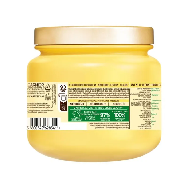Garnier Loving Blends Sun-Kissed Chamomile & Bloemhoning Blond Remedy Haarmasker herstelt het haar, verhelderd en geeft glans. Wist je dat blond haar dunner & kwetsbaar kan zijn? Haar dat verlicht, verbleekt of blootgesteld is aan externe invloeden kan droog, bros of dof worden. Onze intens verzorgende remedie van Verzachtende Kamille & Voedende Bloemhoning herstelt beschadigde haarvezels, voorkomt haarbreuk & onthult een langdurige, verhelderende glans. Laat je stralende, veerkrachtige blond haren herleven! De formule is geschikt voor alle verschillende types blond: natuurlijk, gehighlight & gevoelig. Het Garnier Loving Blends Sun-Kissed Chamomile & Bloemhoning Blond Remedy Haarmasker bevat 97% ingrediënten van natuurlijke oorsprong. De pot is gemaakt van 100% gerecycled plastic*** Garnier zet zich in voor Green Beauty. Ontdek voor nog meer verzorging de gehele routine. Garnier zet zich voortdurend in om de ecologische en sociale impact van haar producten te verminderen tijdens hun gehele levenscyclus, dus inclusief gedurende de productie- en gebruiksfase. Daarnaast streven wij ernaar om jou op een transparante manier toegang te geven tot deze gegevens, zodat jij beter geïnformeerde beslissingen kunt maken over welke producten je aanschaft. Daarom heeft Garnier het Product Impact Labelling Systeem geïntroduceerd. Om zo transparant mogelijk te zijn is deze methode ontwikkeld met de hulp van onafhankelijke wetenschappelijke experts en de gegevens zijn gecontroleerd door het onafhankelijke Bureau Veritas. *Herstelt 52% van de oppervlakte schade. Instrumentele test. **Instrumentele test. ***100% recyclebare pot, behalve kleurstoffen en additieven.