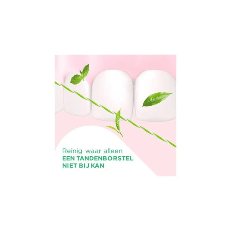 Het is essentieel om elke dag te flossen. Een tandenborstel alleen kan maar de helft van alle plak verwijderen. Om overal te reinigen, moet je flossen. GUM® TWISTED FLOSS helpt je dieper te reinigen, onder de tandvleesrand en tussen de tanden, waar tandplak zich meestal verbergt.Het is gemaakt van twee strak gedraaide draden.Samen bedekken ze 30% meer flosoppervlak dan een standaard flosdraad en glijden ze gemakkelijk tussen jouw tanden terwijl ze een frisse sensatie van groene muntthee geven.