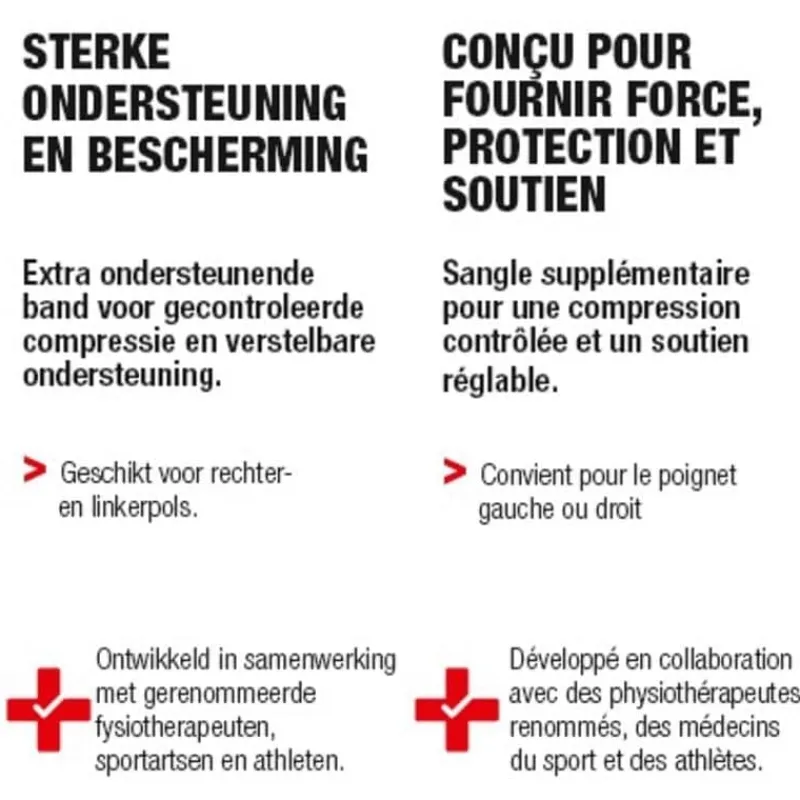 1. Trek de steun/brace over uw hand, vingers eerst. 2. Steek uw duim door het duimgat en plaats de extra versteviging aan de buitenkant op uw polsgewricht. 3. Trek de steun/brace omhoog en verstel met de extra riem rond uw pols.