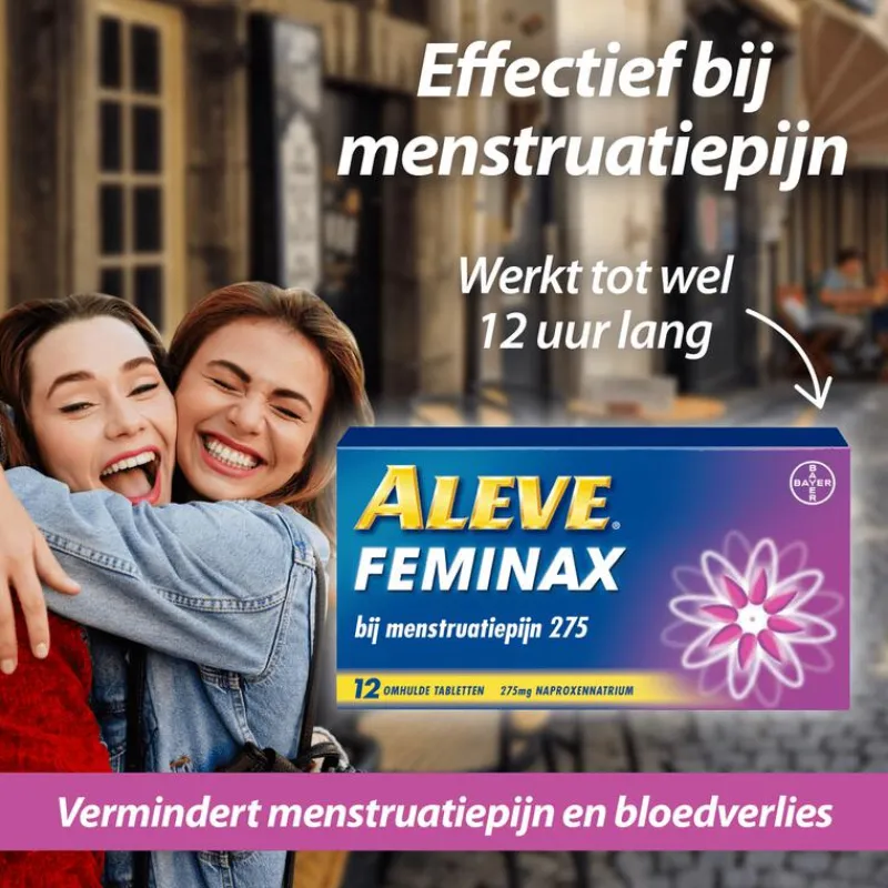 Menstruatiepijn zoals buikpijn kan erg vervelend zijn. Vooral omdat het je kan belemmeren in de dingen die je graag wilt doen. De menstruatiepijn wordt veroorzaakt door prostaglandines. Dit zijn hormoonachtige stoffen die het samentrekken van je baarmoeder stimuleren. Elke maand bereid je lichaam zich voor op een mogelijke zwangerschap door slijmvlies op te bouwen in je baarmoeder. Op de helft van de cyclus komt er een eicel vrij uit je eierstokken, als deze niet bevrucht wordt, is het baarmoederslijmvlies niet nodig en wordt het afgestoten. Dit afstoten gebeurt door het samentrekken van je baarmoeder. Het niveau van de prostaglandines die dit samentrekken van de baarmoeder veroorzaken kan te hoog oplopen. Hierdoor ontstaat menstruatiepijn. Aleve Feminax is speciaal ontwikkeld om de oorzaak van menstruatiepijn effectief aan te pakken. Het haalt de pijn uit je menstruatie. Het zorgt er namelijk voor dat de hoeveelheid prostaglandines niet te hoog oploopt en je baarmoeder dus niet meer zo heftig samentrekt. Je menstruatie gaat ongehinderd door, maar menstruatiekrampen zullen verminderen waardoor ze je plannen niet meer in de war gooien. Naast menstruatiepijn kunnen andere menstruatieklachten zoals overmatig bloedverlies ook vervelend zijn. Aleve Feminax helpt ook om bloedverlies te verminderen. Aleve Feminax in combinatie met het gebruik van bijvoorbeeld de menstruatie cup, tampons, of maandverband kan een goede manier zijn om naast menstruatiepijn, het ongemak van overmatig bloedverlies te verminderen. Probeer ook eens een warm bad of een warme kruik, hierdoor kunnen je spieren ontspannen en dit kan de menstruatiepijn verlichten. Tip: Menstruatiepijn is vaak het hevigst op de eerste dag, want dan is de concentratie prostaglandines het hoogst. Bij beginnende menstruatiepijn is het advies 2 tabletjes Aleve Feminax tegelijk in te nemen. Zo kan je voorkomen dat de hoeveelheid prostaglandines te hoog oploopt en de menstruatie pijnlijk wordt.96%* van de Aleve Feminax gebruiksters is tevreden. Probeer het zelf!*Aleve Feminax poll 2020 n=802.Aleve Feminax. Lees voor gebruik de bijsluiter. Naproxennatrium: niet te gebruiken bij maag-, darm- en andere bloedingen, maagpijn, gelijktijdig gebruik van antistollingsmiddelen, ernstig hartfalen en wanneer u in de laatste 3 maanden van uw zwangerschap bent.