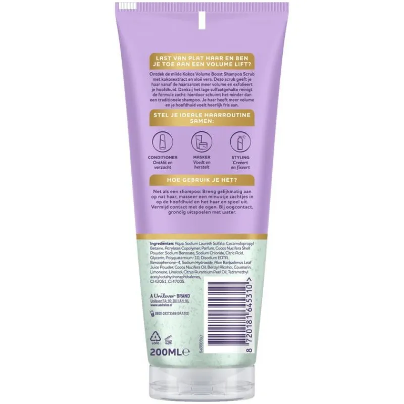 Ontdek de milde Kokos Volume Boost Shampoo Scrub met kokosextract en aloë vera. Deze scrub geeft je haar vanaf de haaraanzet meer volume en exfolieert je hoofdhuid. Dankzij het lage sulfaatgehalte reinigt de formule zacht: hierdoor schuimt het minder dan een traditionele shampoo. Je haar heeft meer volume en je hoofdhuid voelt heerlijk fris aan.