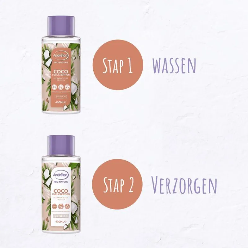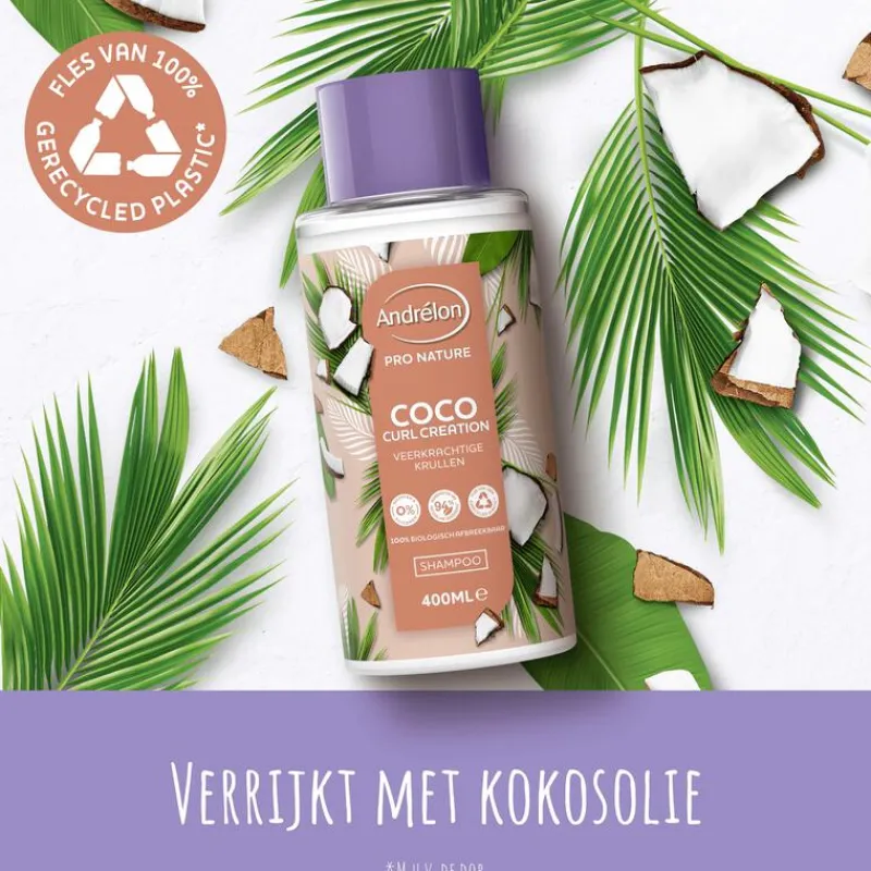 Verwen je krullen met de Coco Curl Creation lijn. De Andrélon Pro Nature Coco Curl Creation Shampoo, met 0% sulfaten en siliconen, hydrateert en verzorgt je krullen intensief. Het voorkomt pluis, creëert mooie, veerkrachtige, natuurlijke krullen en geeft je haar een heerlijke kokosgeur. Deze shampoo is verrijkt met kokosolie en gemaakt met 94% ingrediënten van natuurlijke oorsprong*. Kokosolie staat bekend om zijn voedende werking en is in staat om door te dringen tot in de haarvezel, waardoor het je haar niet verzwaart.