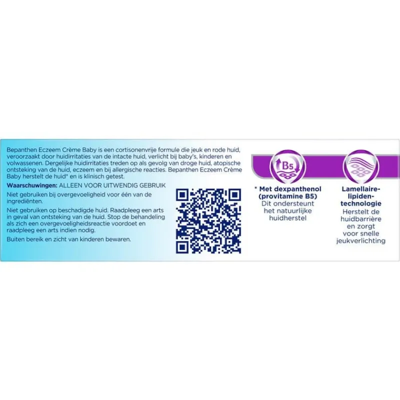 Bepanthen Eczeem Crème is er ook voor de allerkleinsten (te gebruiken vanaf de geboorte) en verkrijgbaar in een kleine variant van 20 gram in het babyschap en online. Bepanthen Eczeem Crème bevat geen cortisonen (hormonen), parfum en parabenen. Bepanthen Eczeem Crème verlicht effectief jeuk en roodheid bij licht tot matig eczeem op de babyhuid. Daarnaast ondersteunt Bepanthen Eczeem Crème het huidherstel* bij huidirritatie, zoals eczeem of een allergische reactie op de babyhuid.Vochtregulerende stoffen zoals glycerine hydrateren de babyhuid en de speciale lamellaire-lipiden technologie herstelt de huidbarrière tussen eczeemuitbraken door bij een eczeemgevoelige en droge babyhuid. Eczeem baby, baby eczeem.Eczeem Crème (eczeemcreme) vs Eczeem Zalf (eczeemzalf)In een enkel geval reageert de eczeem plek niet goed op de crème en heeft de plek een vettere zalf nodig. Dit gebeurt bij de zeer droge variant van eczeem. Een echte uitbraak van eczeem kan het beste met een hormoon zalf (die wordt voorgeschreven door uw dokter) behandeld worden. Voor tussendoor is de Bepanthen Beschermende Zalf een prima uitkomst bij de zeer droge variant van eczeem, bijvoorbeeld bij zeer droge handen.*Bepanthen bevat dexpanthenol. Deze stof heeft de bekende eigenschap het huidherstel te ondersteunen.Bepanthen Eczeem Crème is een medisch hulpmiddel. Lees voor gebruik de gebruiksaanwijzing.