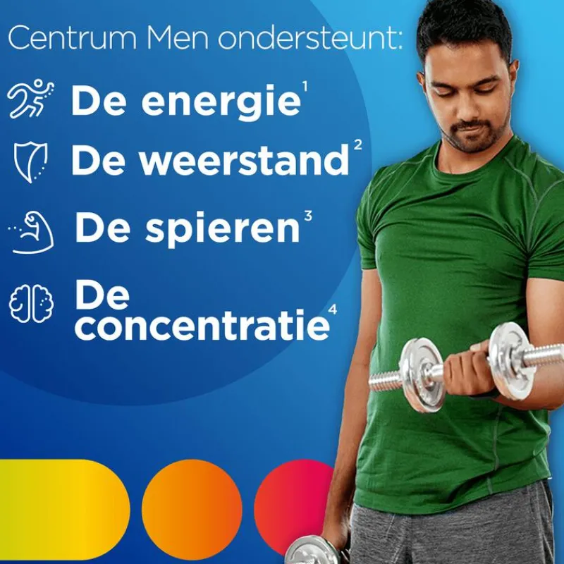 Centrum Men is een compleet multivitamine & mineralen supplement, speciaal ontwikkeld om de voedingsbehoeften van mannen en jongens vanaf 12 jaar te ondersteunen. Mannen zijn anders dan vrouwen. Mannen zijn over het algemeen groter, hebben meer spieren en verbranden sneller calorieën. Daarom hebben ze andere vitaminen en mineralen nodig. Centrum Men bevat belangrijke micronutriënten om de energie, weerstand, spieren en concentratie te ondersteunen. Bevat vitamine C, seleen en zink om de weerstand te ondersteunen en bevat vitamine B6, B12 en ijzer ter ondersteuning van het energieniveau. Bevat calcium, magnesium en vitamine D die bijdragen aan het behoud van een normale werking van de spieren en bevat niacine en biotine dat bijdraagt aan het behoud van een normale psychologische functie, zoals de concentratie. Gluten- en lactosevrij en geschikt voor diabetici.