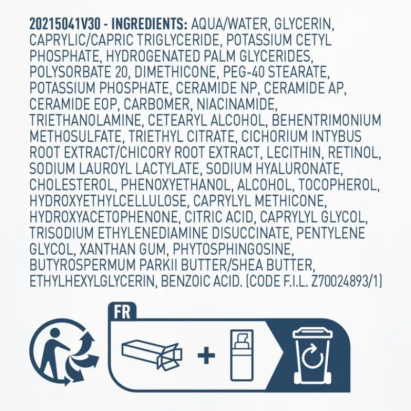 ngrediëntenAQUA / WATER • GLYCERIN • CAPRYLIC/CAPRIC TRIGLYCERIDE • POTASSIUM CETYL PHOSPHATE • HYDROGENATED PALM GLYCERIDES • POLYSORBATE 20 • DIMETHICONE • PEG-40 STEARATE • POTASSIUM PHOSPHATE • CERAMIDE NP • CERAMIDE AP • CERAMIDE EOP • CARBOMER • NIACINAMIDE • TRIETHANOLAMINE • CETEARYL ALCOHOL • BEHENTRIMONIUM METHOSULFATE • TRIETHYL CITRATE • CICHORIUM INTYBUS ROOT EXTRACT / CHICORY ROOT EXTRACT • LECITHIN • RETINOL • SODIUM LAUROYL LACTYLATE • SODIUM HYALURONATE • CHOLESTEROL • PHENOXYETHANOL • ALCOHOL • TOCOPHEROL • HYDROXYETHYLCELLULOSE • CAPRYLYL METHICONE • HYDROXYACETOPHENONE • CITRIC ACID • CAPRYLYL GLYCOL • TRISODIUM ETHYLENEDIAMINE DISUCCINATE • PENTYLENE GLYCOL • XANTHAN GUM • PHYTOSPHINGOSINE • BUTYROSPERMUM PARKII BUTTER / SHEA BUTTER • ETHYLHEXYLGLYCERIN • BENZOIC ACID