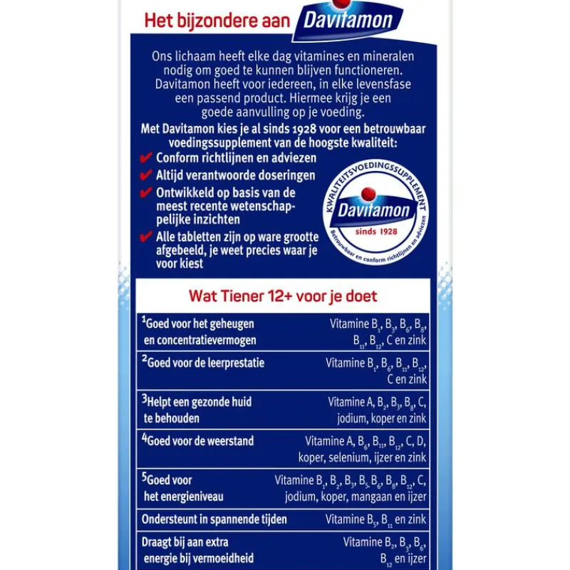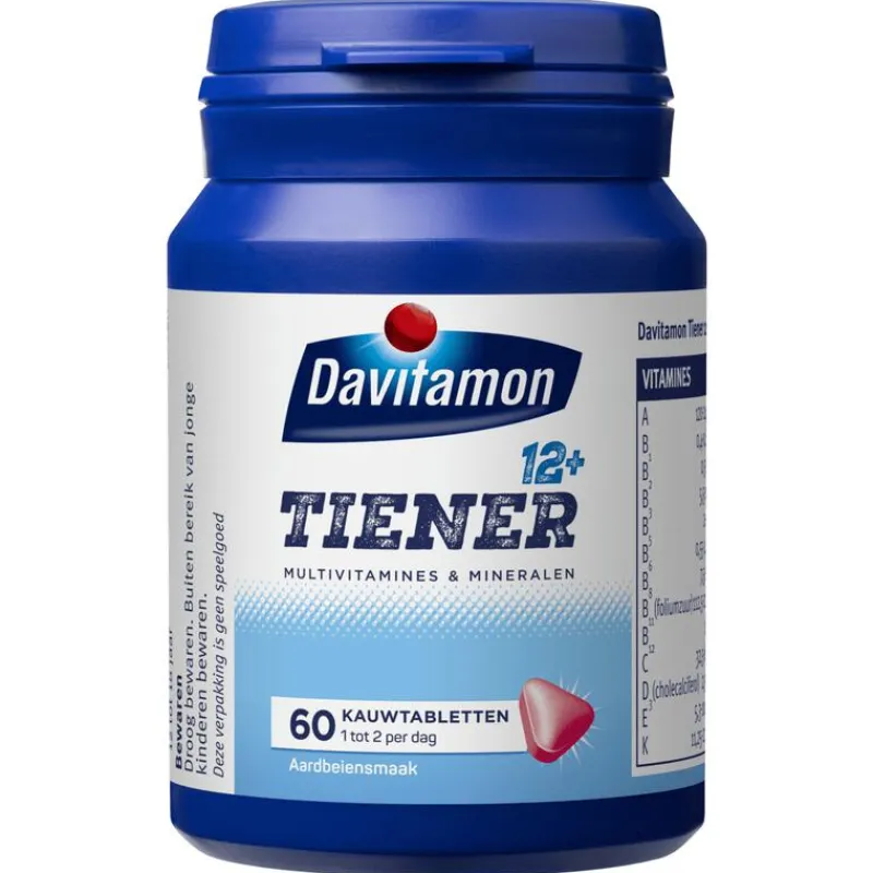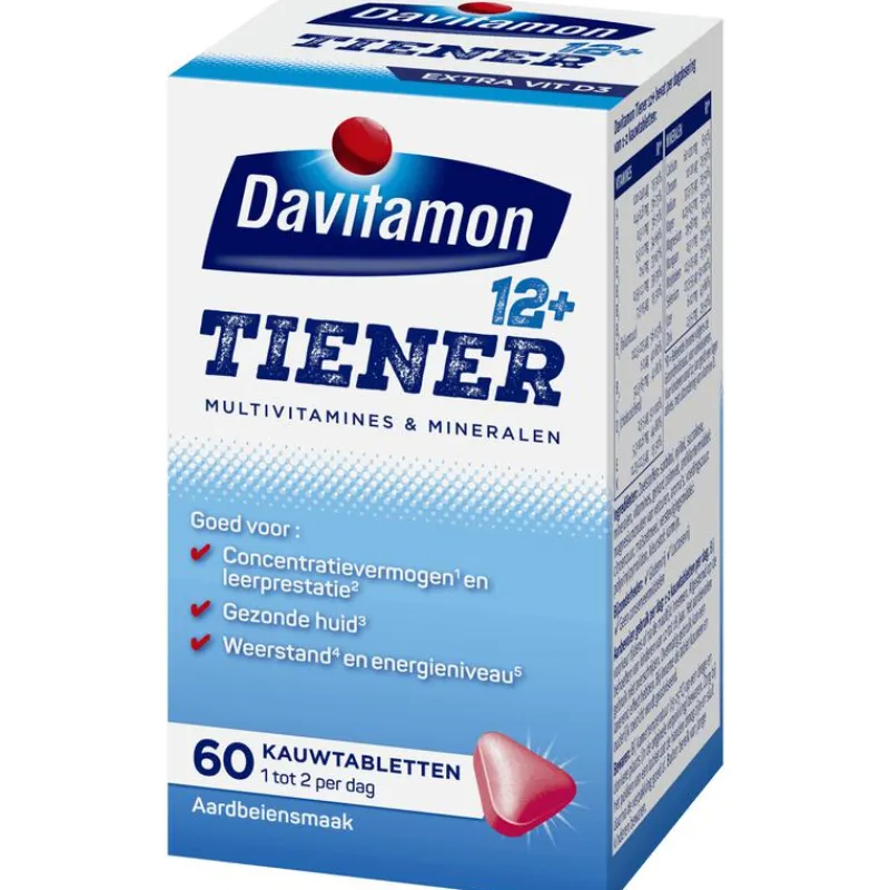 DAVITAMON MULTI BOOST 12+ is een voedingssupplement dat speciaal is ontwikkeld voor jongeren vanaf 12 jaar. De tabletten bevatten verschillende vitamines en mineralen en zijn hierdoor:• Goed voor geheugen en CONCENTRATIEVERMOGEN (vitamine B1, B3, B8, B11, B12, C en zink)• Goed voor de WEERSTAND (vitamine A, B6, B11, B12, zink, mangaan en ijzer)• Goed voor de LEERPRESTATIE (vitamine B1, B6, B11, B12, C, zink, mangaan en ijzer)DE PERFECTE BOOST VOOR TIENERSJongeren ontwikkelen zich super snel en hebben daarom een andere vitamine- en mineralenbehoefte dan volwassenen. Davitamon Multi Boost kauwtabletten 12+ bevatten de juiste hoeveelheden vitamines en mineralen die jongeren van 12-18 jaar dagelijks nodig hebben.ONTDEK DE VOORDELEN:• Bevat geen suiker of conserveermiddelen• Bevat vitamine D3 (goed voor de weerstand)• AardbeiensmaakDAVITAMON, SINDS 1928Om goed te kunnen blijven functioneren heeft ons lichaam elke dag vitamines en mineralen nodig. Daarom heeft Davitamon voor iedereen, in elke levensfase, een ander product. Zo krijg jij de juiste aanvulling op je voeding. Davitamon biedt al sinds 1928 betrouwbare voedingssupplementen aan van de hoogste kwaliteit.