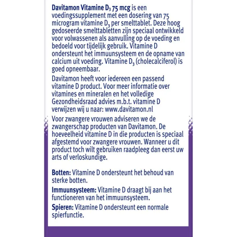 Voor zwangere vrouwen adviseren we de zwangerschap producten van Davitamon. De hoeveelheid vitamine D in die producten is speciaal afgestemd voor zwangere vrouwen. Wanneer u dit product toch wilt gebruiken raadpleeg dan eerst uw arts of verloskundige. Davitamon Vitamine D is goed voor: • De weerstand – Vitamine D draagt bij aan het functioneren van het immuunsysteem• De werking van de spieren – Vitamine D ondersteunt een normale spierfunctie • Het behoud van sterke botten – Vitamine D ondersteunt het behoud van sterke botten. Werking van de spierenDit allemaal in enkel één smelttablet per dag.