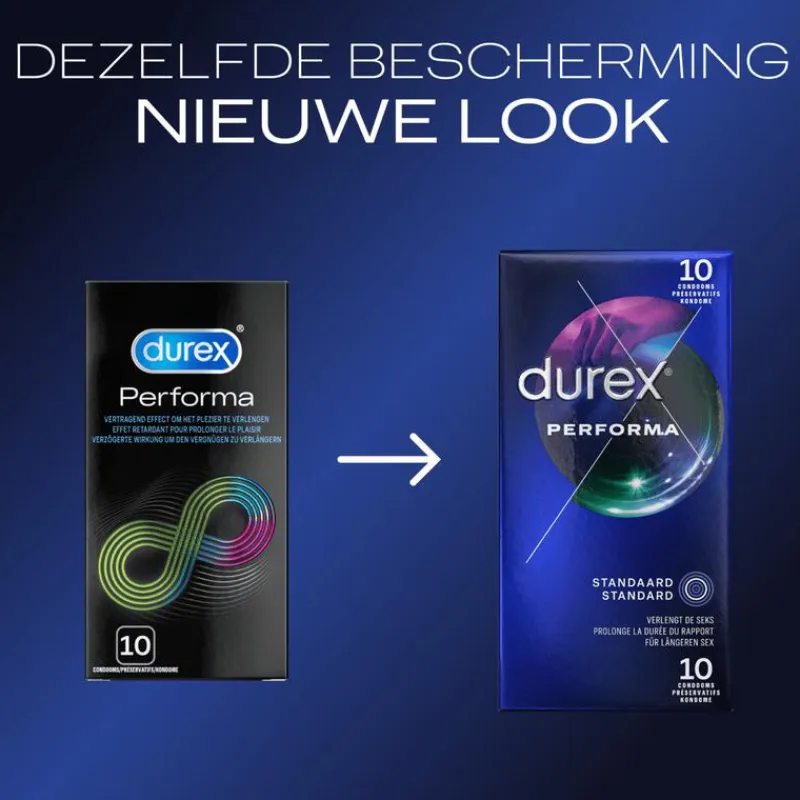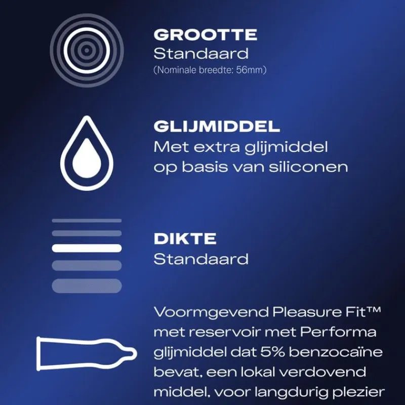 HET GEHEIM VAN HET GENOT DAT ERG LANG DUURT. • De Durex Condooms Performa heeft een speciaal glijmiddel dat 5% benzocaïne bevat maar zonder zaaddodende stoffen, waardoor je de seksuele opwinding kunt verlengen en de ejaculatie kunt uitstellen. VEILIGHEIDSVOORSCHRIFTEN: Lees de gebruiksaanwijzing aan de binnenkant van de verpakking aandachtig door, vooral bij gebruik van het condoom voor anale of orale seks. Geen enkel voorbehoedsmiddel biedt u een 100% betrouwbare bescherming tegen zwangerschap, hiv (aids) of andere seksueel overdraagbare aandoeningen. Condooms kunnen verstikkingsgevaar opleveren. Buiten bereik van kinderen bewaren.